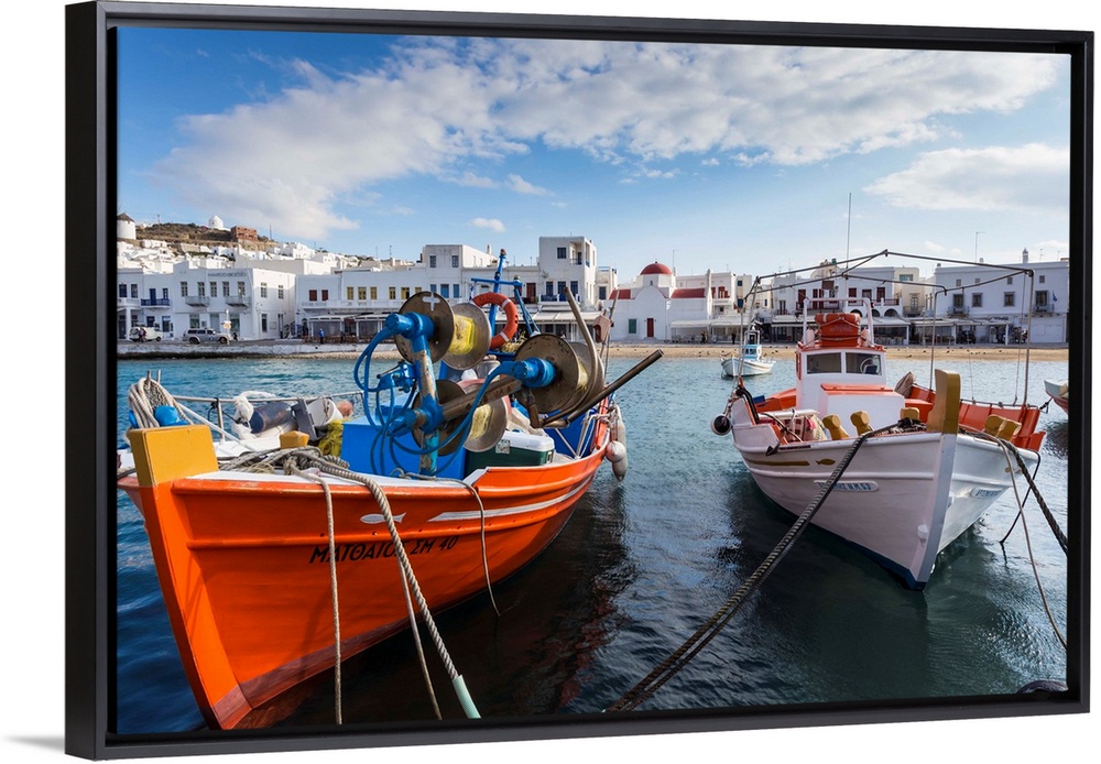 <p>Colourful boats in harbour, whitewashed Mykonos Town with windmills and churches, Mykonos, Cyclades, Greek Islands, Greece</p>