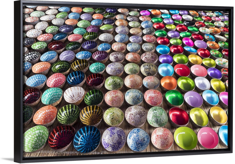 <p>Colourful bowls made out of coconut shells, Sapa, Sa Pa District, Lao Cai Province, Vietnam</p>