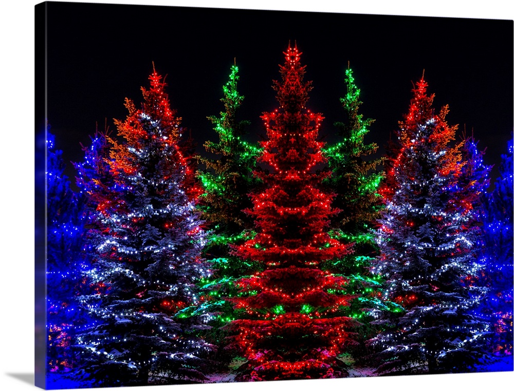 <p>Colourful Christmas lights around several evergreen trees; Calgary, Alberta, Canada</p>