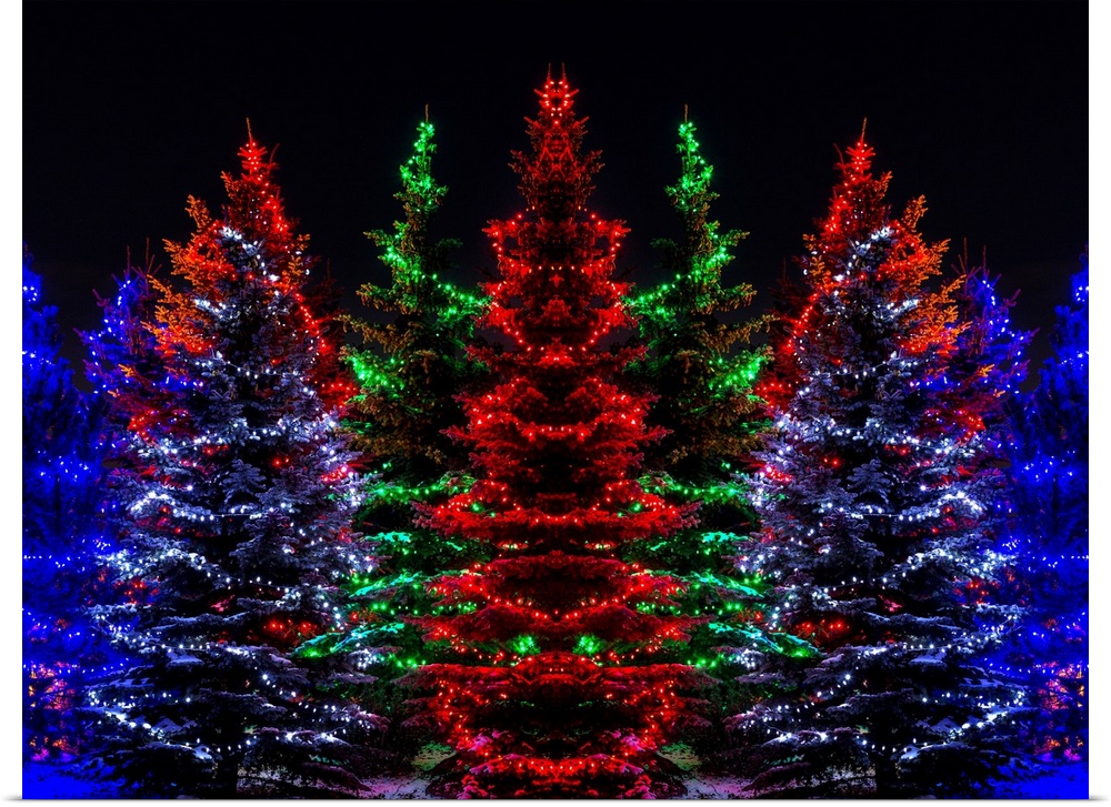 <p>Colourful Christmas lights around several evergreen trees; Calgary, Alberta, Canada</p>