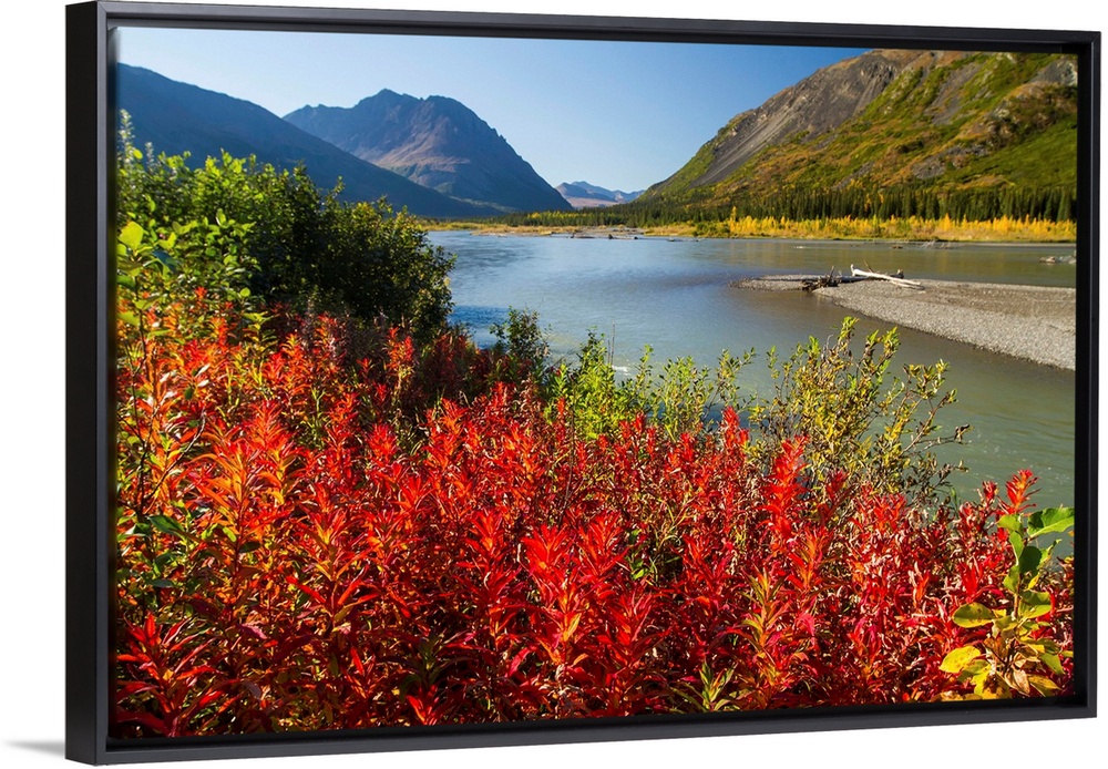 <p>Colourful foliage changing from summer to autumn, South of Denali National Park and Preserve, viewed from Parks Highway, interior Alaska, Alaska, United States of America.</p>