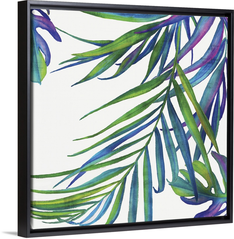 <p>Square decor with illustrated tropical leaves in blue, purple, and green hues on a white background.</p>