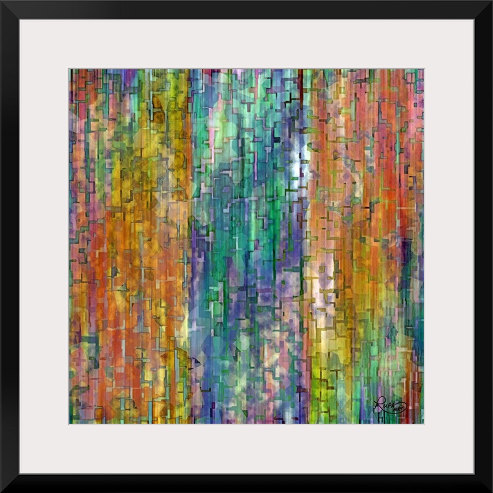 <p>Square abstract artwork in a rainbow of colors with small block and line shapes.</p>
