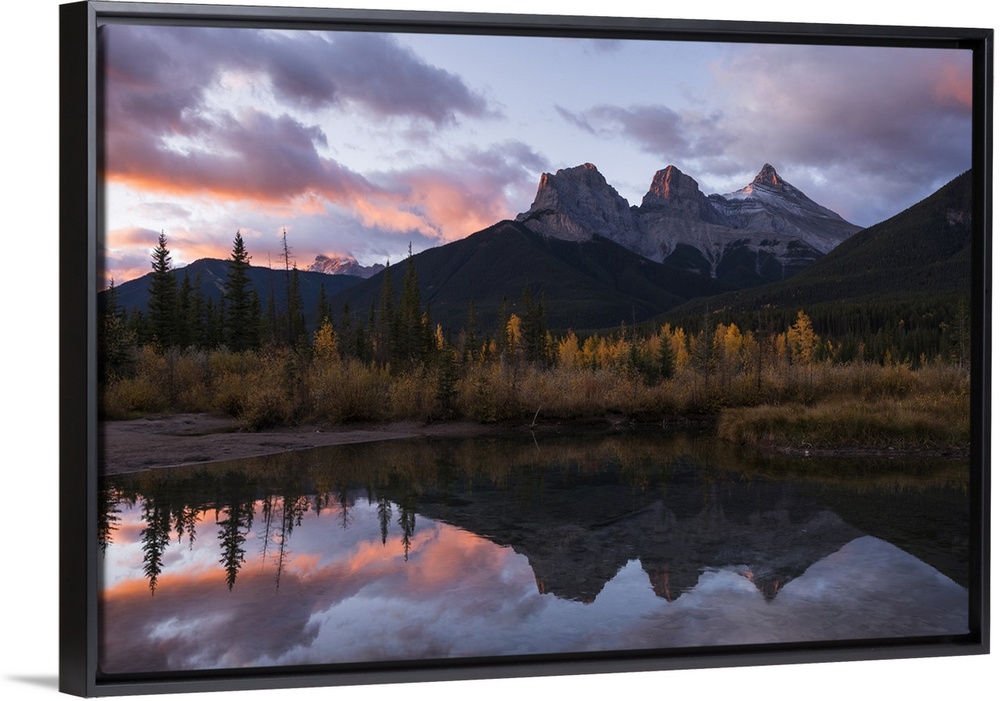 <p>Colourful sunrise over Three Sisters at Policeman Creek in autumn, Canmore, Banff, Alberta, Canadian Rockies, Canada, North America</p>