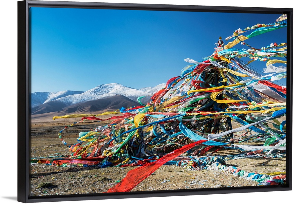 <p>Colourful Tibetan prayer flags (Lung ta) under the strong wind with white mountain tops in the background, Qinghai province, Tibet.</p>