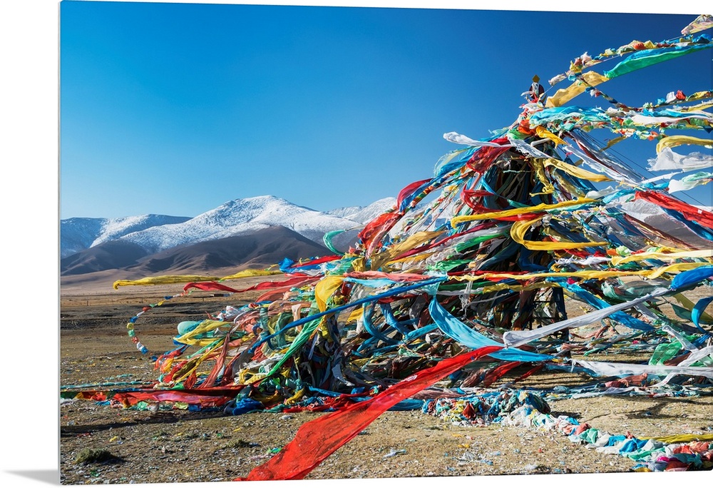 <p>Colourful Tibetan prayer flags (Lung ta) under the strong wind with white mountain tops in the background, Qinghai province, Tibet.</p>