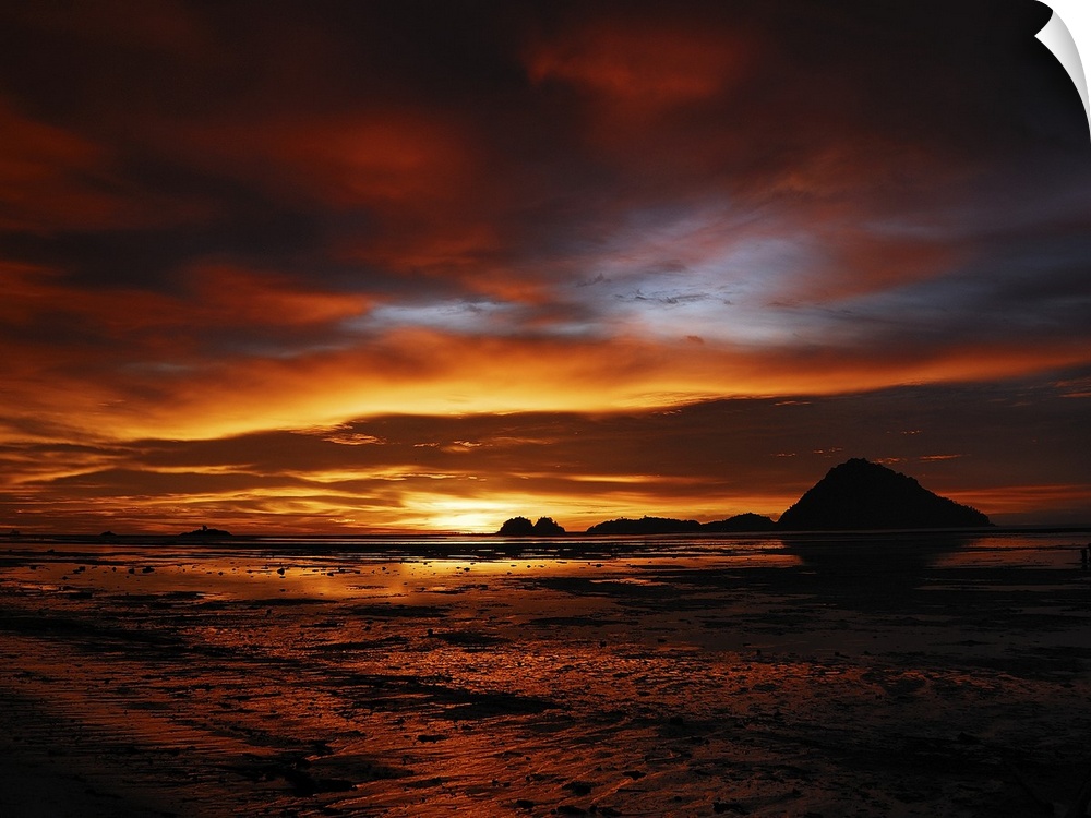 <p>Vibrant sunset colors illuminating the clouds above a beach.</p>
