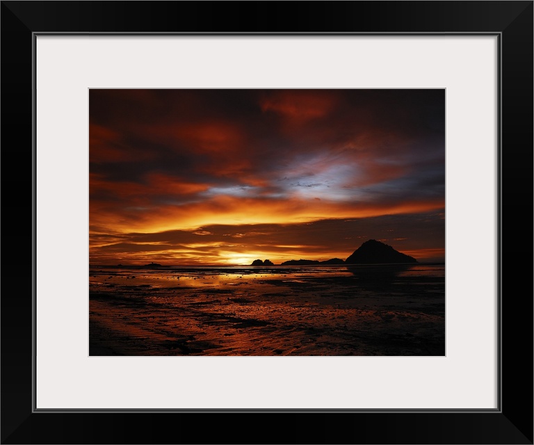 <p>Vibrant sunset colors illuminating the clouds above a beach.</p>