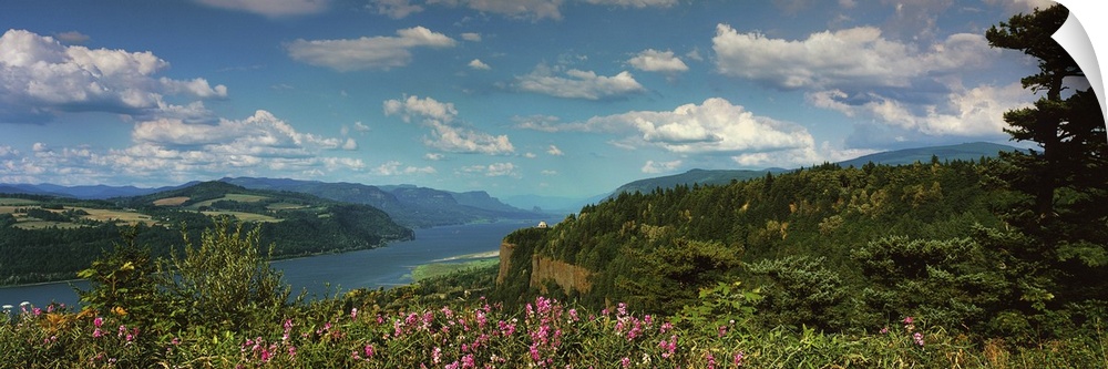 <p>A bright blue sky with clouds over the Columbia River Gorge.</p>