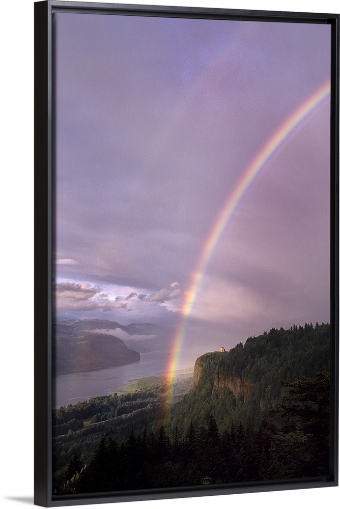 <p>A rainbow across a pastel lavender sky over the Columbia River Gorge.</p>