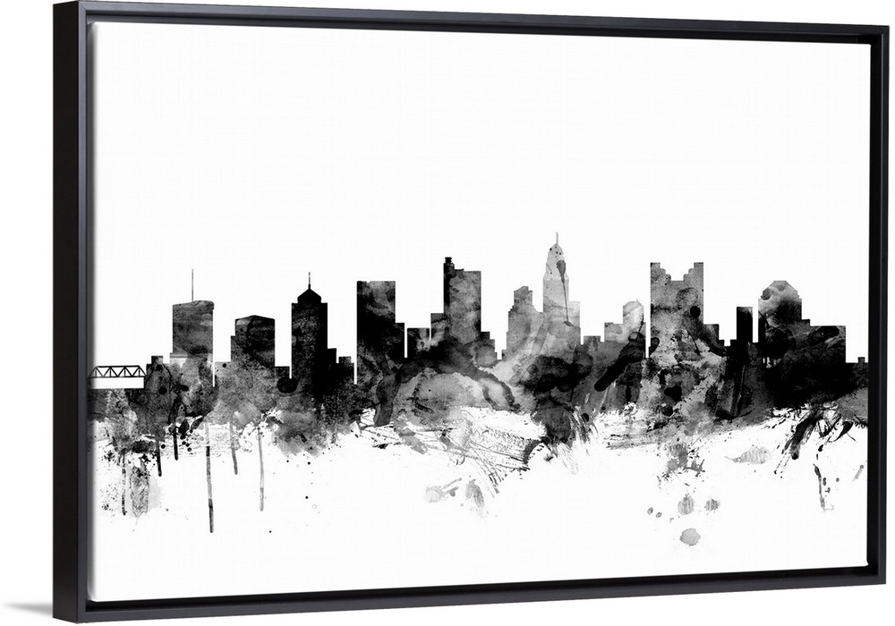 <p>Contemporary artwork of the Columbus city skyline in black watercolor paint splashes.</p>