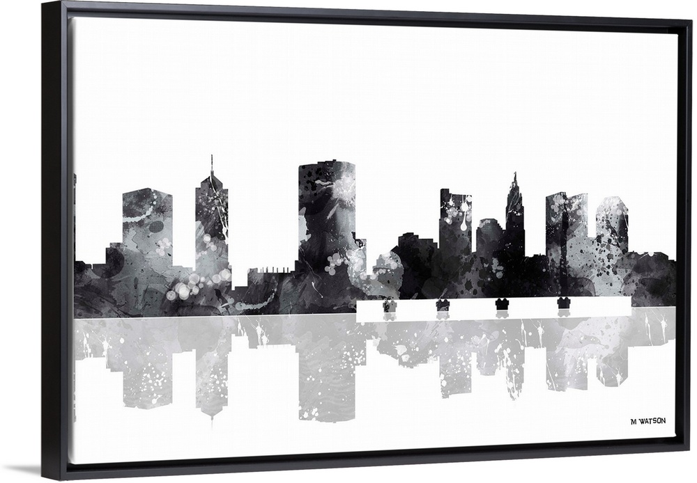 <p>Contemporary black and white watercolor skyline casting a mirror-like reflection below.</p>