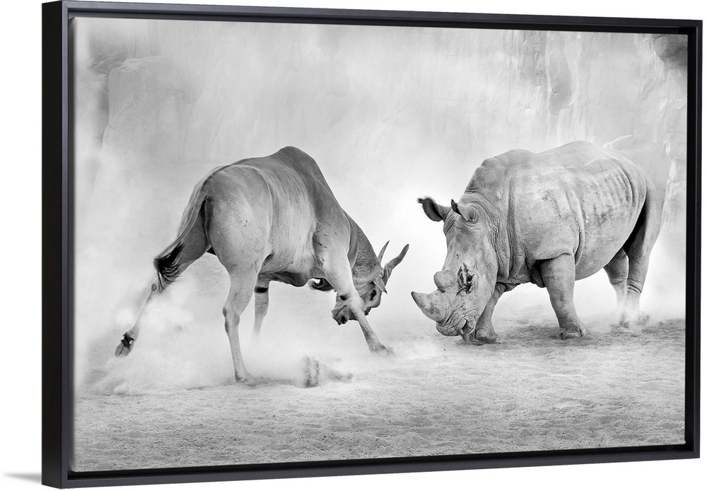 <p>Black and white image of a standoff between an antelope and a rhinoceros.</p>