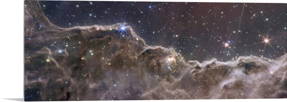 <p>A never-before-seen view of a star-forming region in the Carina Nebula. Captured in infrared light by the Near-Infrared Camera (NIRCam) and Mid-Infrared Instrument (MIRI), by the James Webb Space Telescope, this combined image reveals previously invisible areas of star birth. What looks much like craggy mountains on a moonlit evening is actually the edge of a nearby, young, star-forming region known as NGC 3324. Called the Cosmic Cliffs, this rim of a gigantic, gaseous cavity is roughly 7,600 light-years away. The cavernous area has been carved from the nebula by the intense ultraviolet radiation and stellar winds from extremely massive, hot, young stars located in the center of the bubble, above the area shown in this image. The high-energy radiation from these stars is sculpting the nebula's wall by slowly eroding it away. NIRCam, with its crisp resolution and unparalleled sensitivity, unveils hundreds of previously hidden stars, and even numerous background galaxies. In MIRI's view, young stars and their dusty, planet-forming disks shine brightly in the mid-infrared, appearing pink and red. MIRI reveals structures that are embedded in the dust and uncovers the stellar sources of massive jets and outflows. With MIRI, the organic, soot-like material on the surface of the ridges glows, giving the appearance of jagged rocks. This period of very early star formation is difficult to capture because, for an individual star, it lasts only about 50,000 to 100,000 years - but Webb's extreme sensitivity and exquisite spatial resolution have chronicled this rare event. NGC 3324 was first catalogued by James Dunlop in 1826. Visible from the Southern Hemisphere, it is located at the northwest corner of the Carina Nebula (NGC 3372), which resides in the constellation Carina. The Carina Nebula is home to the Keyhole Nebula and the active, unstable supergiant star called Eta Carinae.</p>