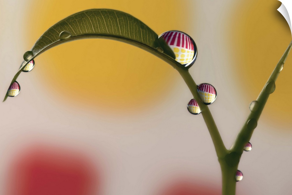 <p>A macro photograph of a water droplet sitting atop a small leaf on a stem.</p>