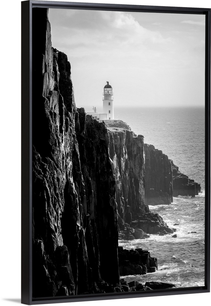 <p>Fine art photo of a lighthouse at the edge of a cliff by the ocean in black and white.</p>