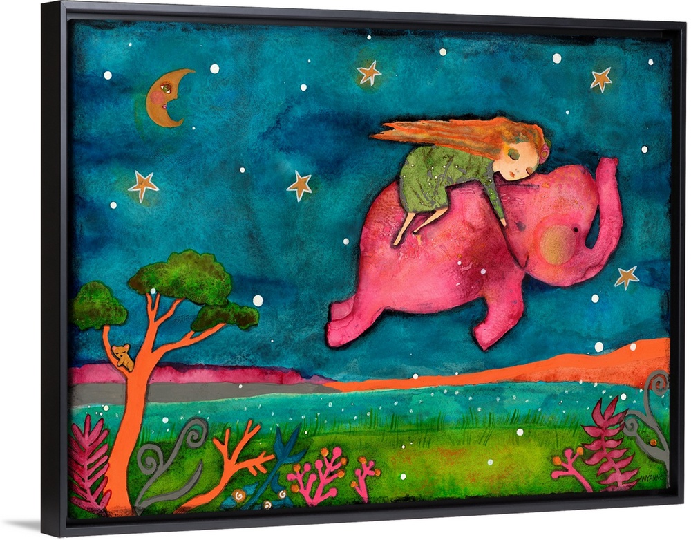 <p>A girl on a pink elephant flying through the night sky.</p>