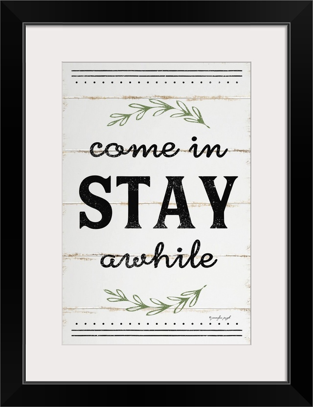 <p>A digital illustration of "Come in STAY awhile" on a white shiplap background.</p>