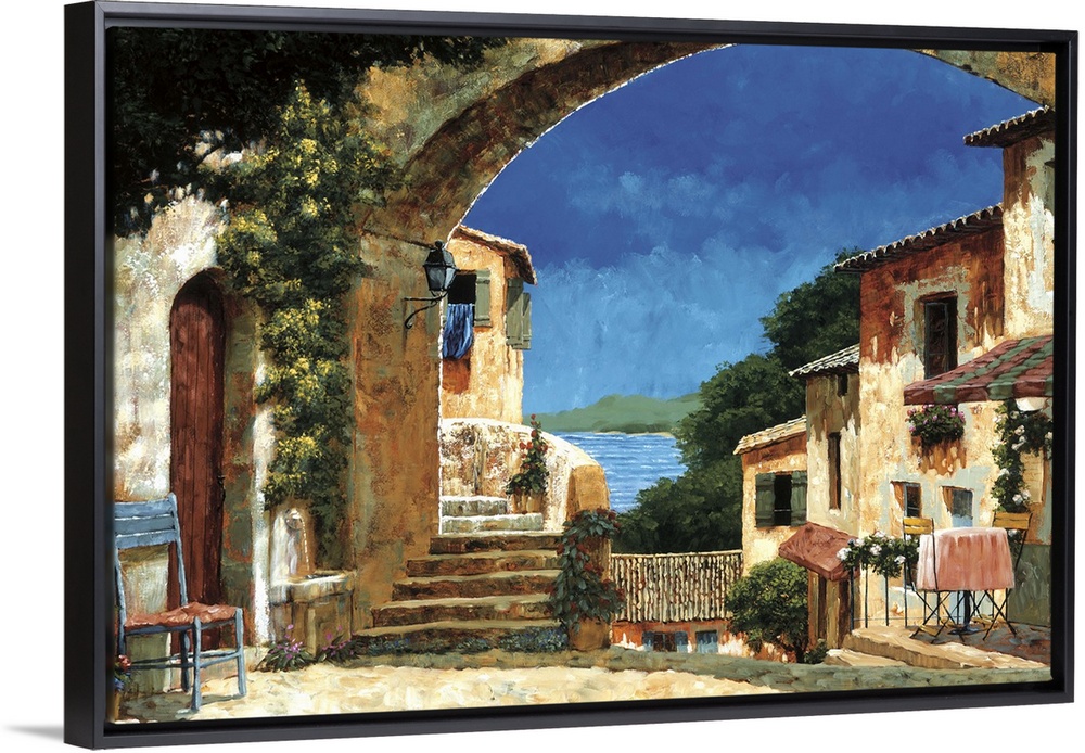 <p>Painting of a European villa with a stone archway on a sunny day.</p>