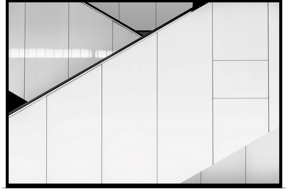 <p>Criss crossed stairwells with white paneling, creating an abstract geometric image.</p>