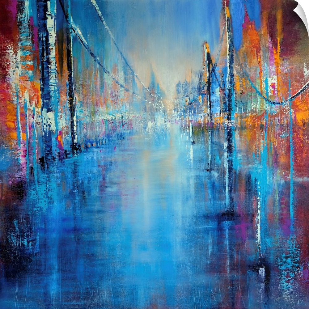 <p>Abstractly painted cityscape with a suspension bridge in bright colors and structures: a large, lively city in red, orange and blue with the silhouette of skyscrapers. Reflection in the water.</p>