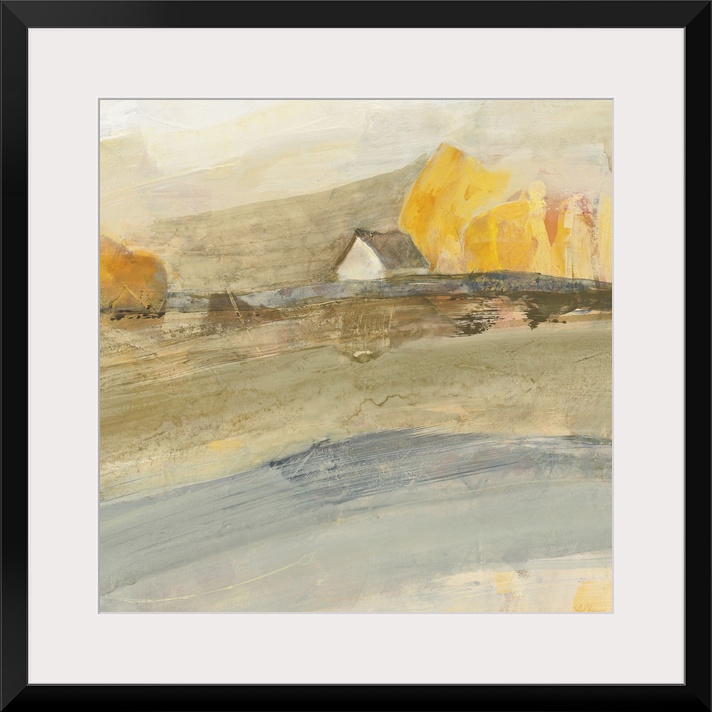 <p>Contemporary landscape painting of a single house surrounded by yellow trees and an open field in neutral colors.</p>