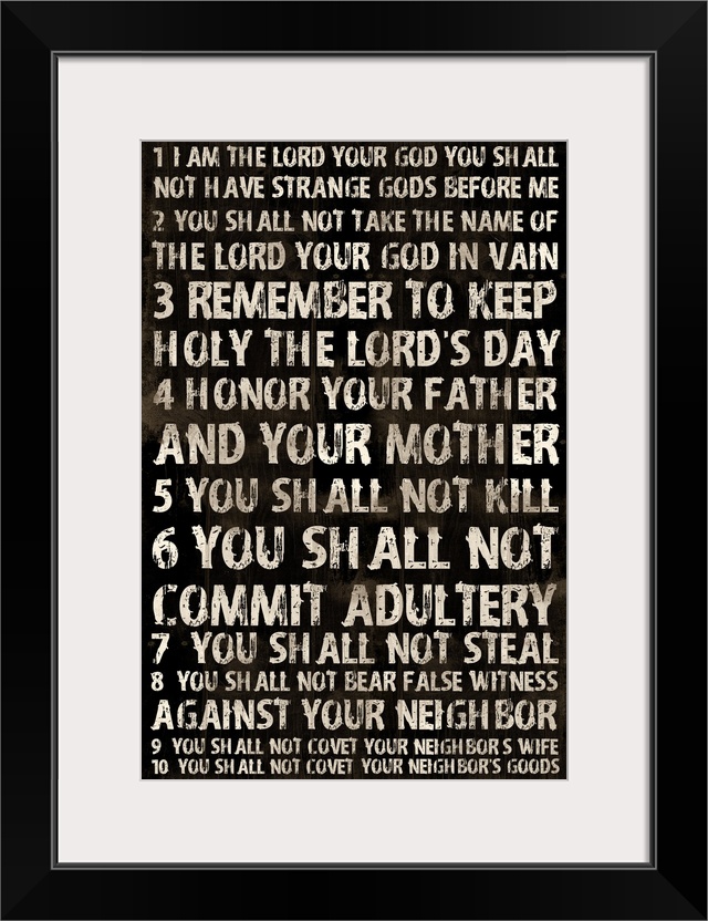 <p>Religious typography art, with the ten commandments in a weathered, rustic look.</p>