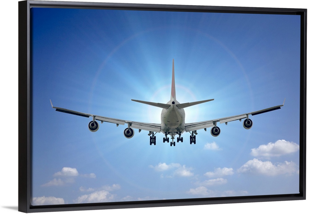 <p>Large airplane flies directly towards the sun on a clear blue day.</p>