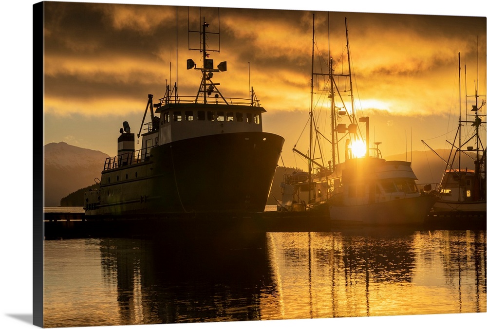 <p>Commercial fishing boats in Auke Bay at sunset, Southeast Alaska; Juneau, Alaska, United States of America.</p>