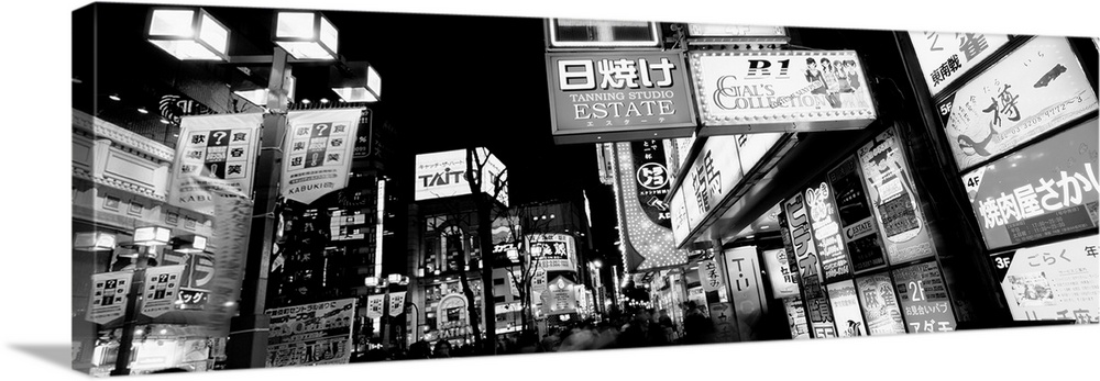 <p>Commercial signboards lit up at night in a market, Shinjuku Ward, Tokyo Prefecture, Kanto Region, Japan.</p>