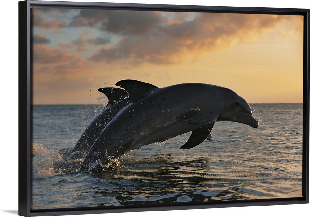 <p>Common Bottlenose Dolphins Jumping in Sea at Sunset, Roatan, Bay Islands, Honduras</p>