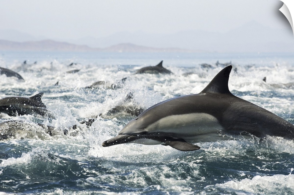 <p>Common dolphins (Delphinus delphis) fleeing an attack from killer whales.</p>