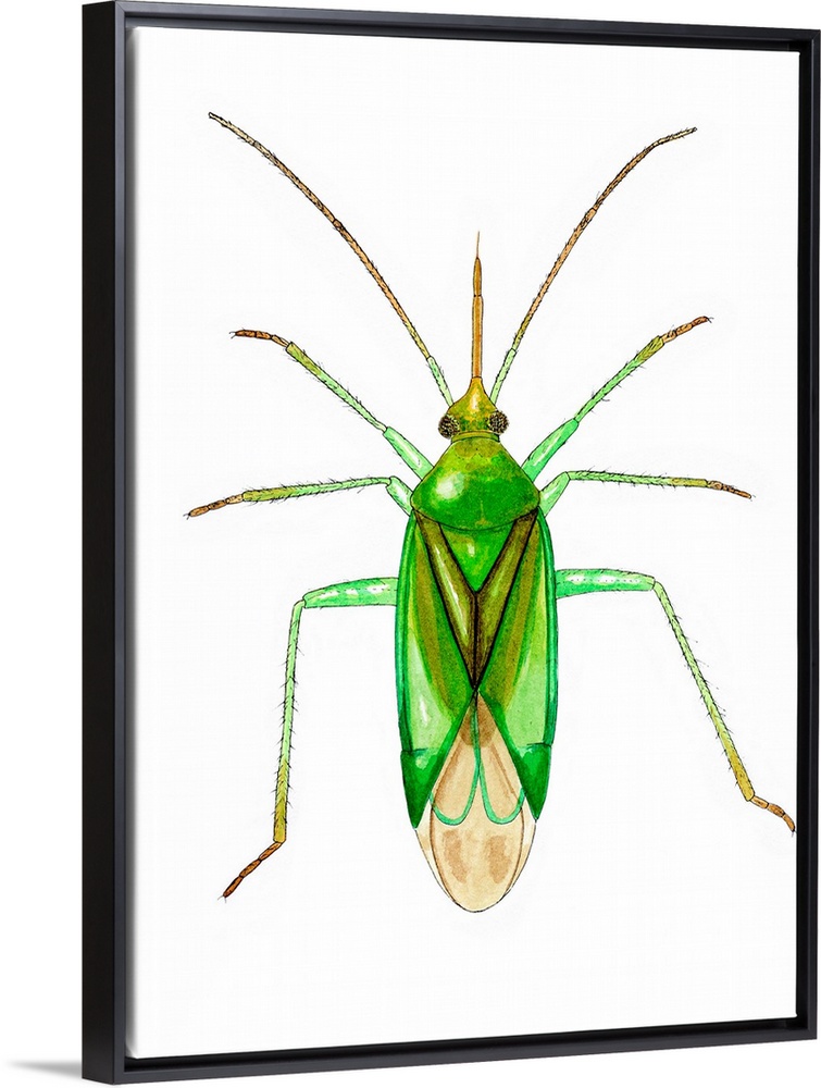 <p>Common green capsid bug (Lygocoris pabulinus), artwork. This species of plant bug measures between 5.6-6.0mm long. Its bright green colour serves to camouflage it against the plants on which it feeds. It is a common pest of many species of garden plant, feeding on the sap of young shoot tips and buds. When it feeds it secretes a chemical which causes the surrounding tissue to die. When the buds open the dead areas tear open and holes appear in the new leaves.</p>