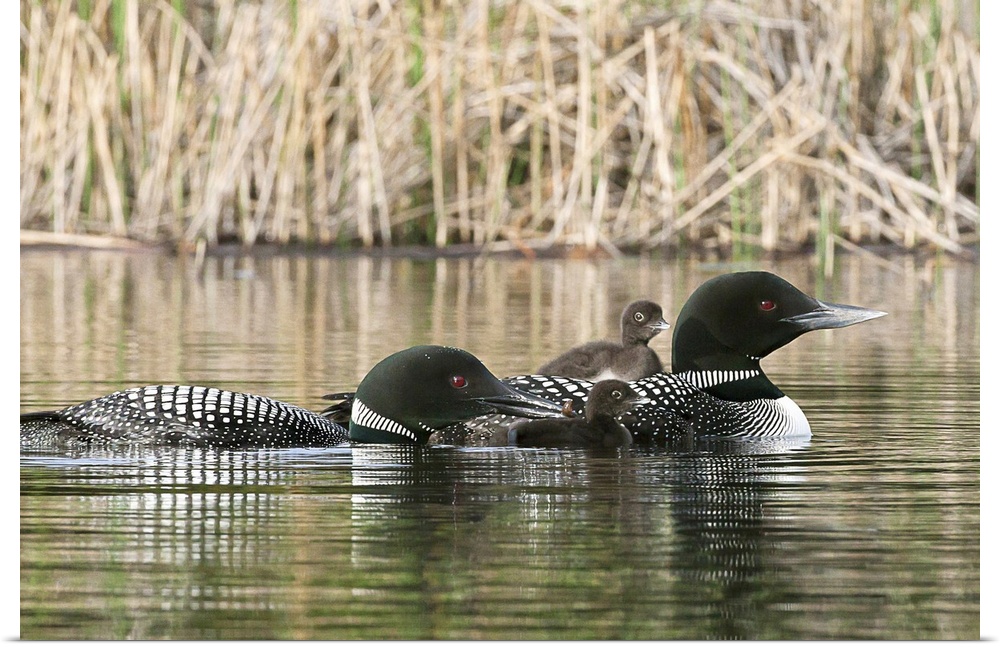 <p>North America, Canada, British Columbia. Common Loon, (Gavia immer) family. One adult loon is giving an aquatic insect to its chick.</p>
