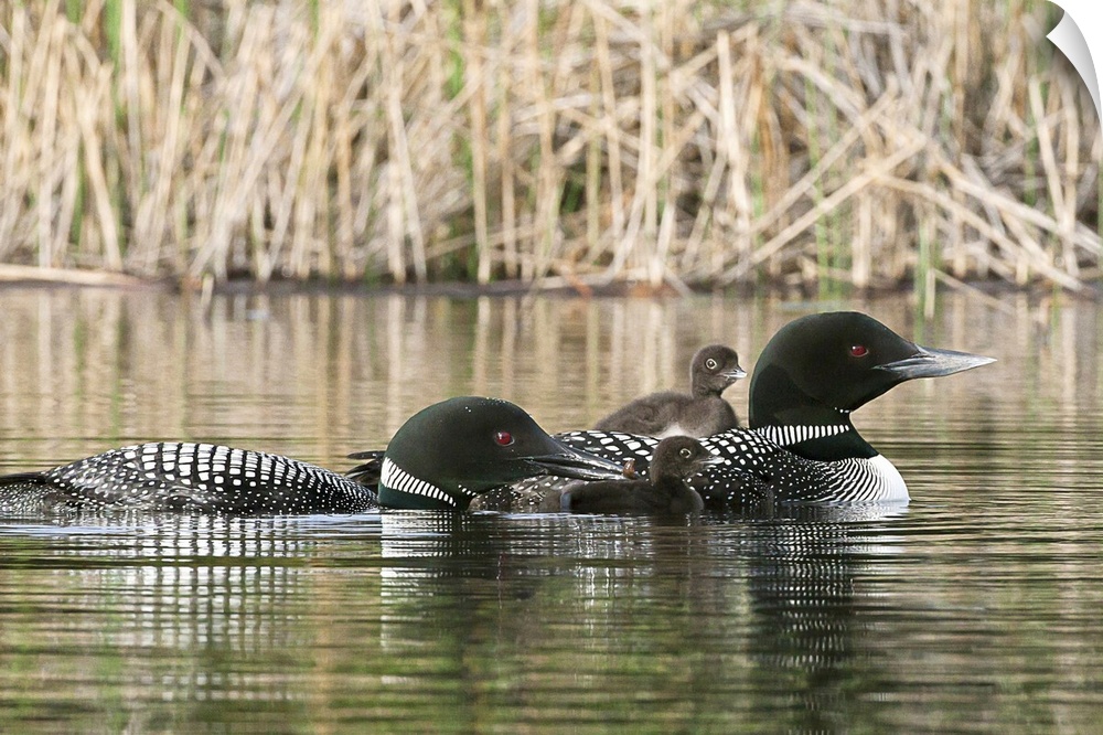 <p>North America, Canada, British Columbia. Common Loon, (Gavia immer) family. One adult loon is giving an aquatic insect to its chick.</p>