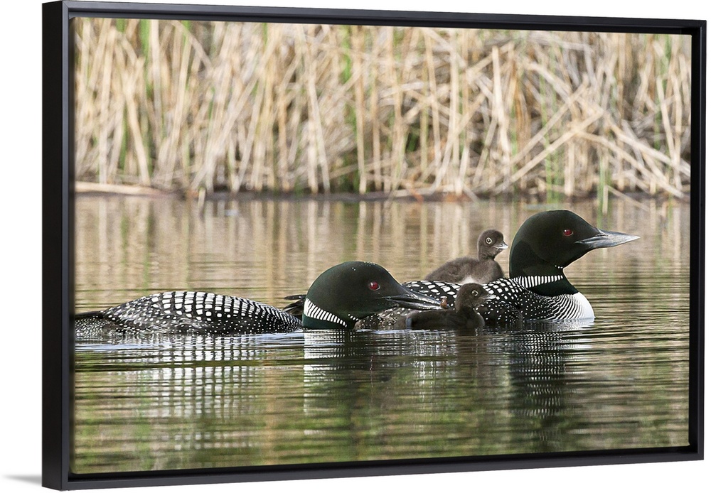 <p>North America, Canada, British Columbia. Common Loon, (Gavia immer) family. One adult loon is giving an aquatic insect to its chick.</p>
