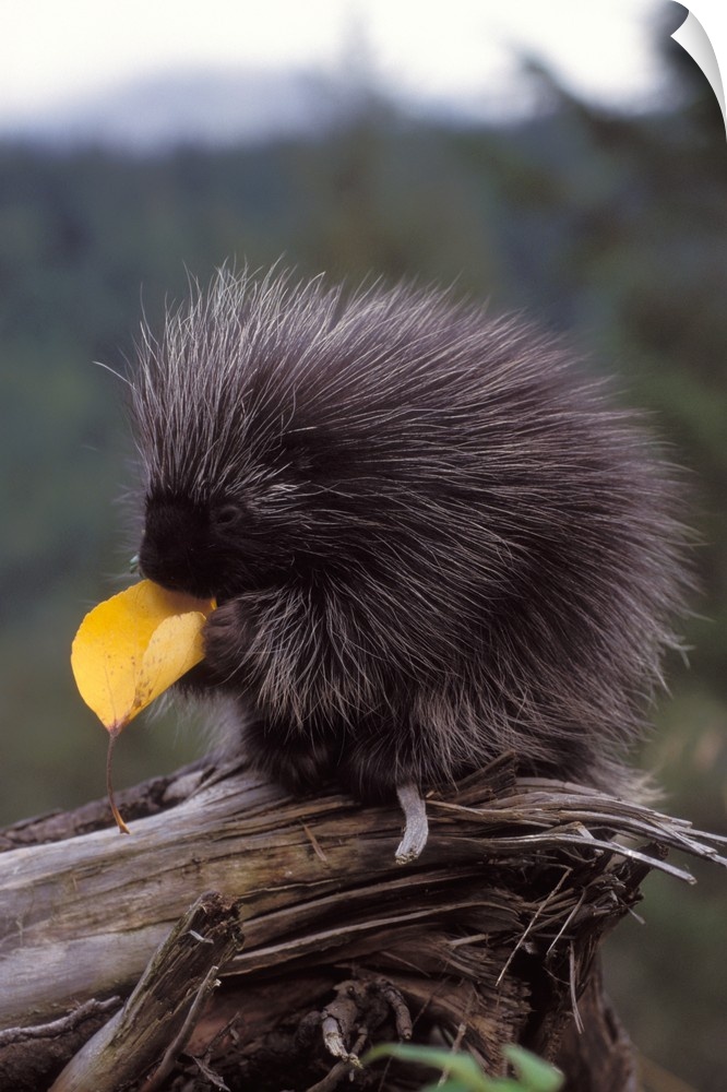 <p>Common porcupine (Erethizon dorsatum) eating a cottonwood tree leaf in the foothills of the Takshanuk mountains, northern southeast Alaska.</p>