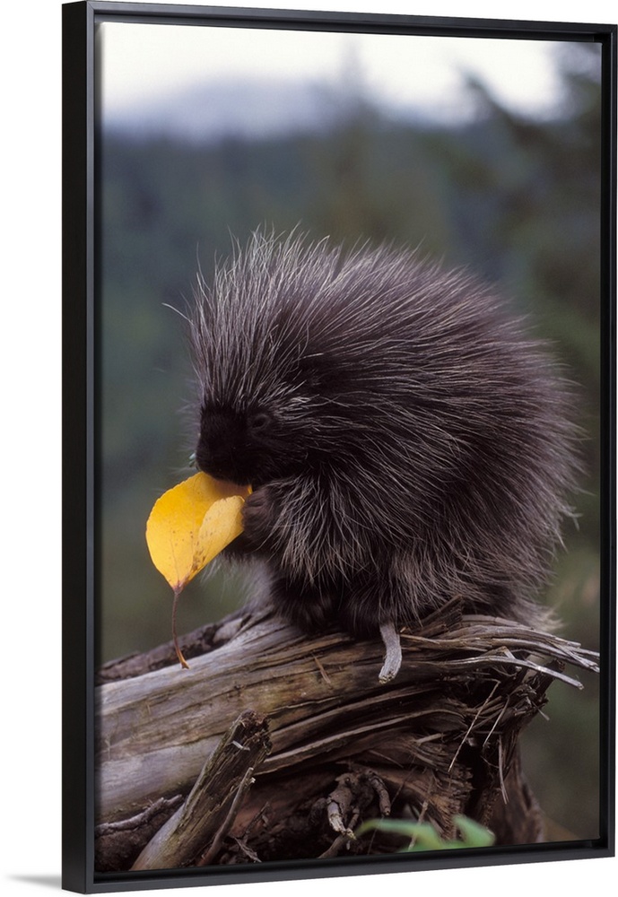 <p>Common porcupine (Erethizon dorsatum) eating a cottonwood tree leaf in the foothills of the Takshanuk mountains, northern southeast Alaska.</p>