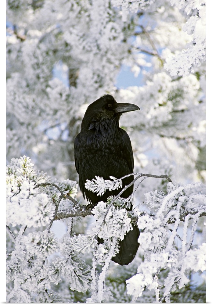 <p>North America, USA, Wyoming, Yellowstone National Park. A Common Raven (Corvus corax) in winter.</p>