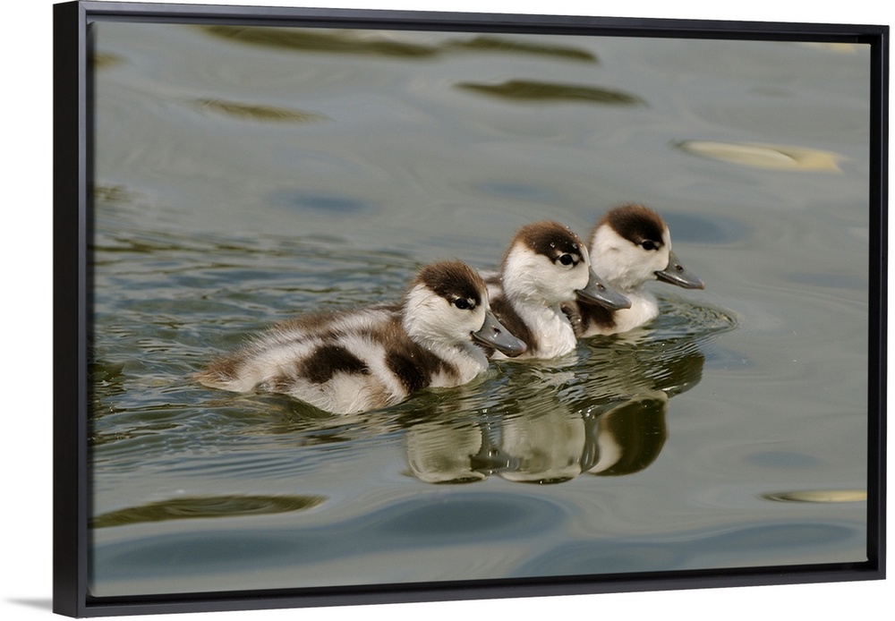 <p>Common Shelduck (Tadorna tadorna) three ducklings, swimming together, Slimbridge, Gloucestershire, England</p>