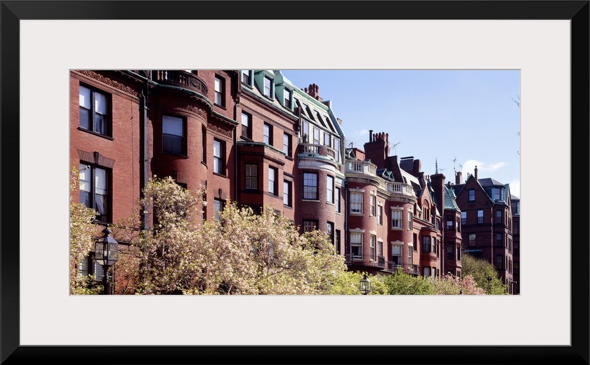 <p>Wide angle photograph of tree tops in front of a row of brick buildings along Commonwealth Avenue in Boston, Massachusetts.</p>