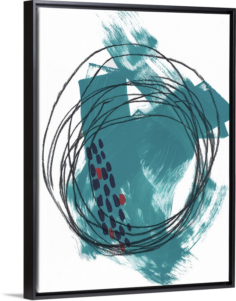<p>Abstract painting of multiple black circles intertwining, with smaller dots of dark blue and red with strokes of paint in teal on the background.</p>