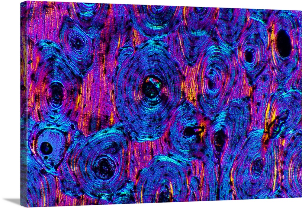 <p>Compact bone. Polarised light micrograph of a transverse section through compact bone tissue, showing Haversian canals (circular regions). The concentric rings surrounding the Haversian canals are called lamellae. The canals run along the long skeletal bones, and contain blood vessels, lymphatic vessels, and nerves. The lamellae are made of compacted collagen fibres and minerals produced by bone-forming cells that are called osteoblasts. The osteoblasts become trapped in the bone matrix at sites called lacunae (small dark spots spaced throughout). Magnification: x103 when printed at 10 centimetres across.</p>
