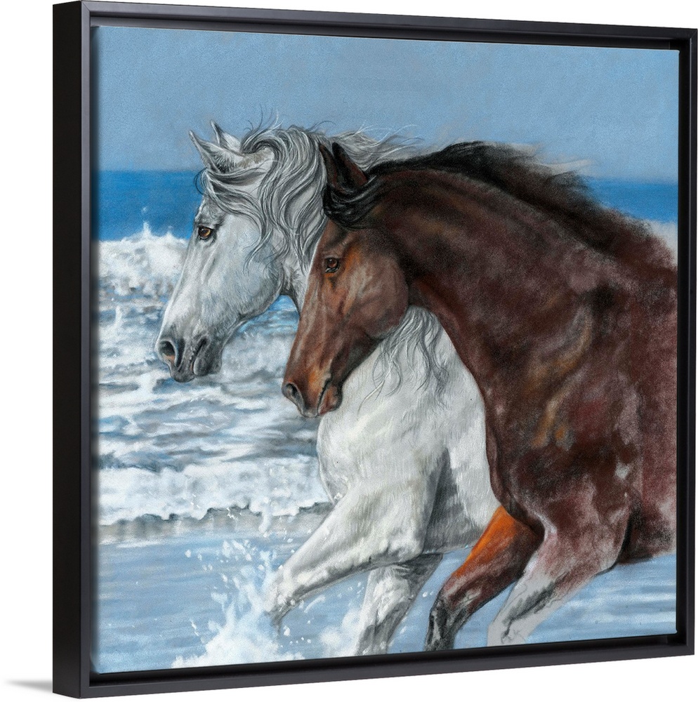<p>Artwork of a white and a brown horse galloping through ocean water on a beach.</p>