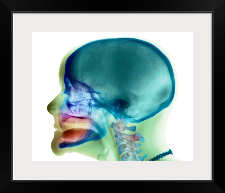 <p>Loss of teeth. Coloured X-ray (side view) of the head of a 49 year old woman showing complete loss of teeth in both upper and lower jaws. Soft tissues outline the profile of her face, the tongue is visible in the mouth, while the skull is seen with vertebral column of the neck. A necklace is present around the neck. Teeth can be lost due to infections of the gums (gingivitis) or the teeth themselves (caries).</p>