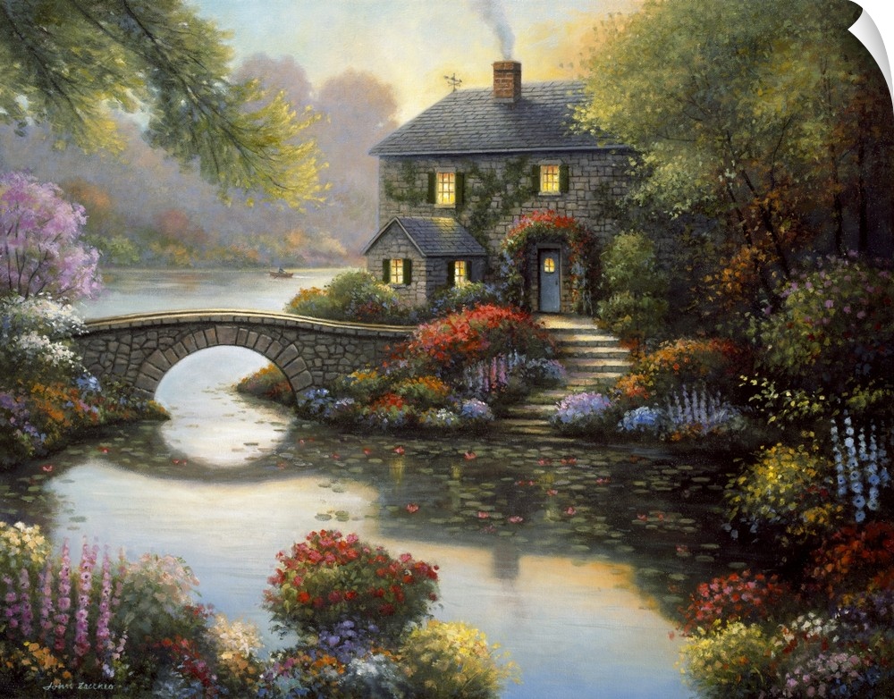 <p>Stone cottage at the edge of a river by a stone bridge.</p>