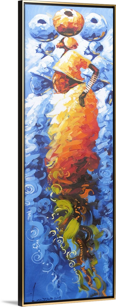 <p>Depicted in vibrant hues, three African women embody a world of virtues. They are strong, proud and elegant, and each works hard to help assure her family a good life. Ghanaian artist Bernard Mensah depicts merchants who buy and sell in the market.</p>