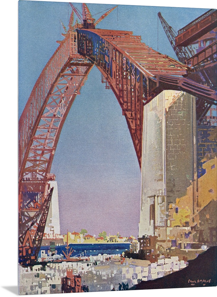 <p>Completing the arch of Sydney Harbour Bridge, Australia. From The Wonder Book of Science, published 1930's.</p>