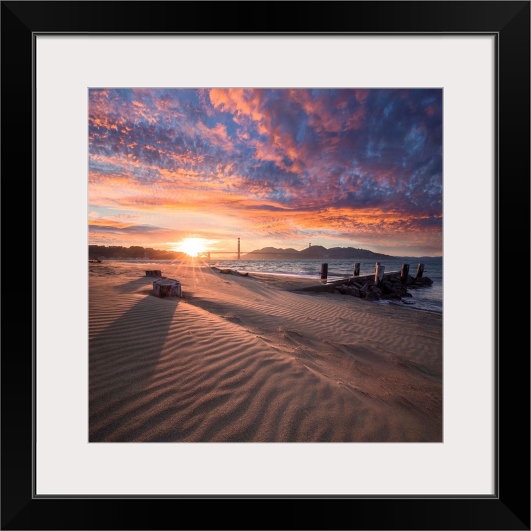<p>A square photograph of a beach with the golden gate bridge in the background at sunset.</p>
