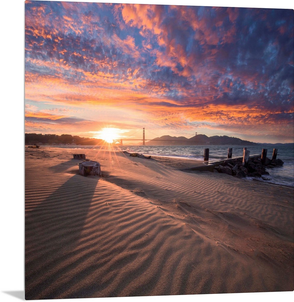 <p>A square photograph of a beach with the golden gate bridge in the background at sunset.</p>